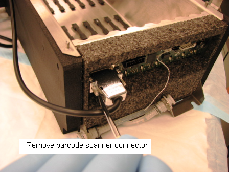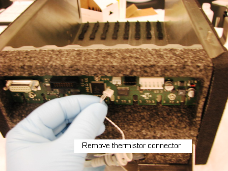 Disconnect the thermistor and barcode scanner connectors from the PCB.