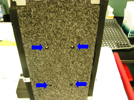 Using a 7 mm socket or nut driver, remove the four 4 mm nuts and washers that secure the solid foam insulation to the bottom of the module. The soft foam rubber on the sides of the module is attached with double stick tape and may make it difficult to remove the foam from the bottom. Peel the sticky foam back where it is attached to the bottom foam.