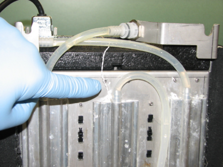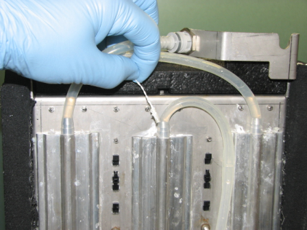 Route the thermistor wires to the rear of the module and connect to the printed circuit board.- Carefully replace the solid foam insulation on the module. Be sure that the liquid cooling lines are properly inserted in the channels provided or the foam will not sit flush.