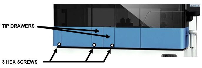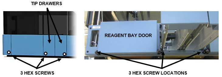 Loosen the three 2.5 mm hex screws located on either side of the Reagent Bay and on either side of the Tip Drawer.