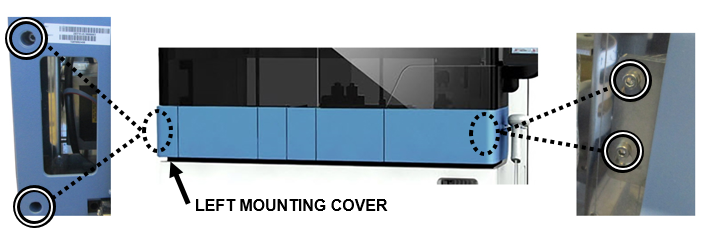 Remove the Left Mounting Cover. Loosen and remove the four 3 mm hex screws on the far left and right of the Front Cover. Carefully allow the cover to rest on the open Tip Drawers for support.