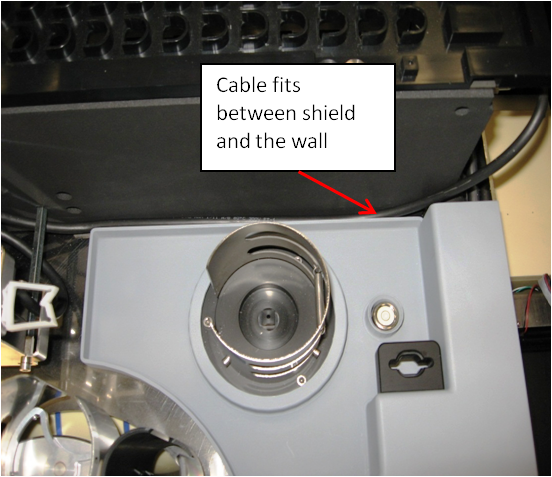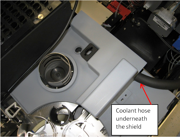 Re-install the TCR mixer drip shield and route the coolant hose underneath the shield. Ensure that the Reagent Bay barcode scanner cable fits between the TCR mixer drip shield and the Sample Bay.