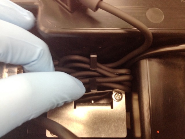 Remove the excess scanner cabling from its holder. Use your finger to push the tabs allowing the cable to be removed.