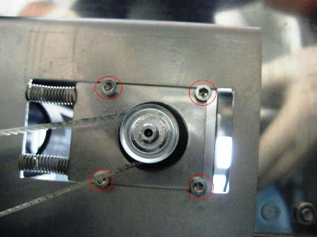 - Using the 2.5 mm ball driver or Allen key, tighten the four bolts that secure the belt tensioning bracket to the TCR base plate.