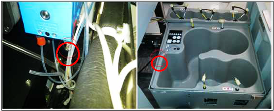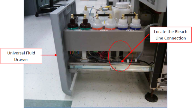 The Panther System bleach line underneath the universal fluids drawer tray will be inspected and replaced, if necessary.