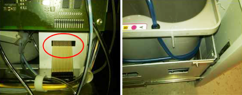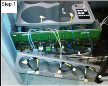 Disconnect the Universal Fluids LED indicator display board from the Universal Fluids PCB prior to lifting the Wash and Deactivation fluid tray out of the drawer.