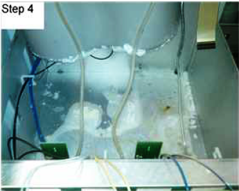 Clean any dried bleach that has accumulated under the fluids tray. Inspect the inside of the system near the vacuum pump module and the liquid cooling unit for evidence of leaking bleach and clean.