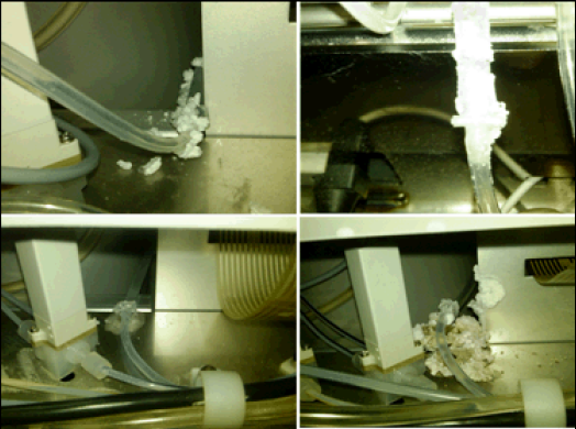 The reduction barb fitting that connects the tube from the bleach bottle to the tube that runs to the deactivation peristaltic pump tends to crack and leak over time.