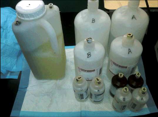 Mark A and B on the respective universal fluids bottle kits. Remove the bottles and set them aside on an absorbent pad.