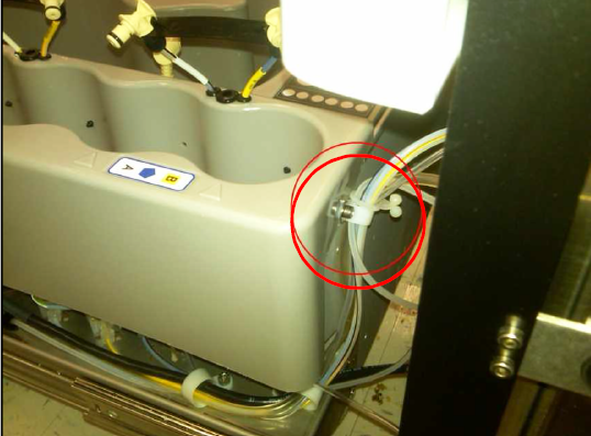 A visual inspection of the fitting can be done by tracing the bleach line to the right hand side of the universal fluids drawer.