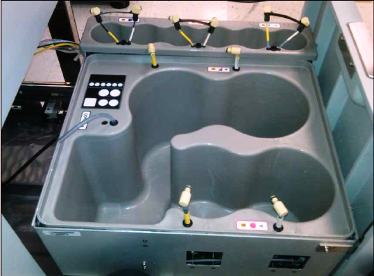 Carefully lift out and position the Wash and Deactivation fluid tray to the left hand side of the Universal Fluids drawer. Be careful not to damage or kink any fluid lines or RFID antennae.