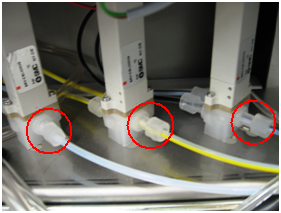 Disconnect the Auto Detect 1, Auto Detect 2, and Oil fluid lines from each solenoid valve outlet (fluid lines that lead to the pumps). Use an absorbent pad to catch any fluid that drains from the disconnected lines..
