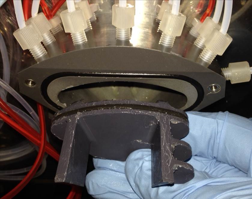 Several Panther Systems have experienced shut-downs due to clogging of the vacuum manifold. Sample material exiting the MagSWash Aspirator tubing mixes with bleach exiting the Output Queue tubes and can create a solid residue inside the Vacuum Manifold. See the image below of a very high volume system. This residue can build and clog the vacuum sensor port, leading to a system failure.