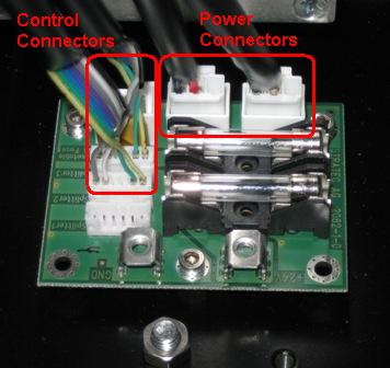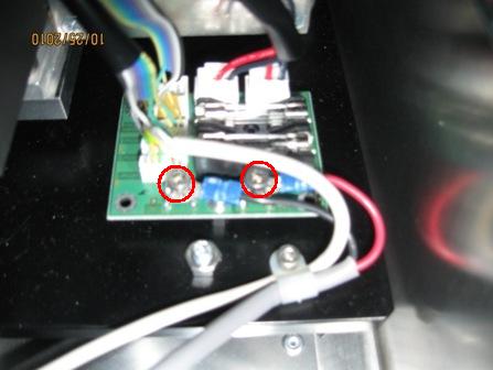 Using a 3 mm hex drive, disconnect both power cable connections from the PCB.