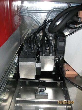Disconnect the two black vacuum tubes from barbed connections to braided, clear tubing. (Label if necessary, one black tube comes from the Waste Drawer and one goes to the muffler.)- Locate the PCB on the back left corner of the base of the vacuum module. (The PCB may also be found on the front right corner of the base.)
