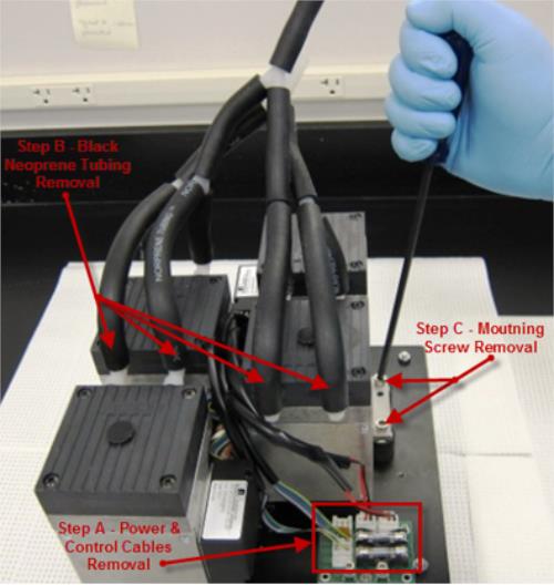 - Disconnect the black norprene tubing from the inlet and exhaust ports of the affected vacuum pump (shown as "Step B" below).
