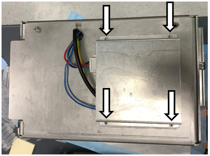 Unscrew the 4 screws shown below on the bottom of the slide plate.