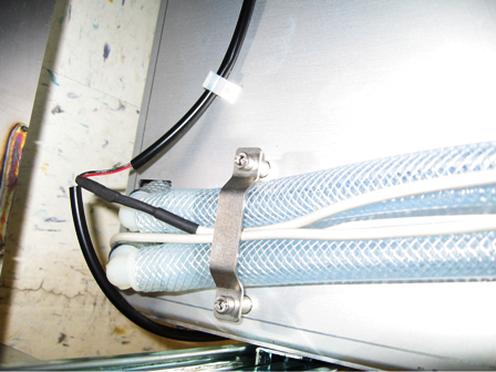 Free the waste bottle empty/full sensor cable from the cable holder and vacuum hose. The red line in the picture below shows the path of the cable.