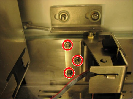 Using an 8 mm open-ended wrench, remove the three nuts that secure the Waste Drawer lock.- Gently remove the Waste Drawer Lock with the Flex Cable connected. Do not pull on the Flex Cable.