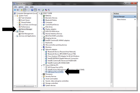 - Expand the Ports (COM and LPT) section. Find the Serial-to-USB adapter and note the COM port assigned to it. The COM port is found in parentheses.