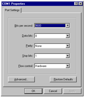 At the COMX Properties (X is the port number chosen above) window, change the Bits per second to 9600 and click OK.