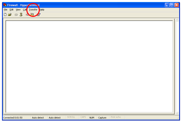 Note— Before reprogramming any firewall, it is extremely important to download the current firewall configuration for backup purposes. This will ensure that no information is lost and having the backup information will be vital in troubleshooting in case the reprogramming is not successful. Steps 11 to 19 are instructions to perform the backup. - Open the Transfer drop-down menu (at the red circle in the image above) and click Capture Text. The Capture Text feature will capture all text seen in the window into a text file.