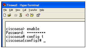 After the ciscoasa# prompt type config t and press Enter. The prompt changes to ciscoasa(config)#.