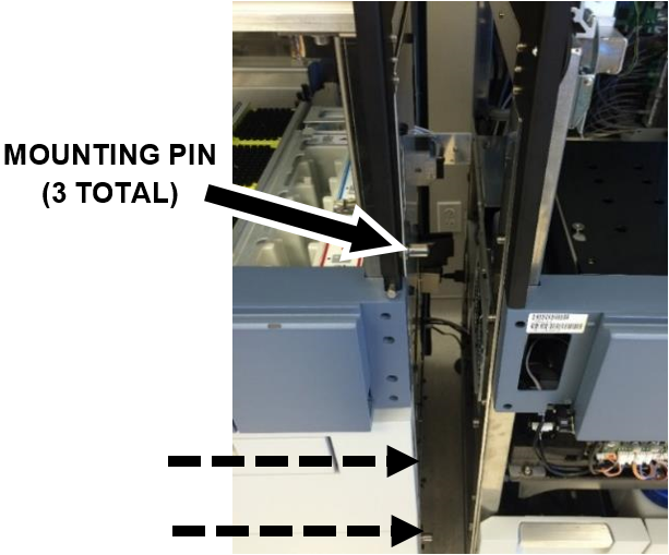 - Make sure that the Fusion Module mounting pins (3) align into the corresponding mounting holes on the Panther System. Additional leveling of the Fusion Module caster wheels may be necessary to re-mount the Fusion Module. If possible, avoid altering the leveling of the Panther System.