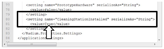 In the <applicationSettings> section of the file, set the value of the "CleaningStationInstalled" variable for <setting name> to True.