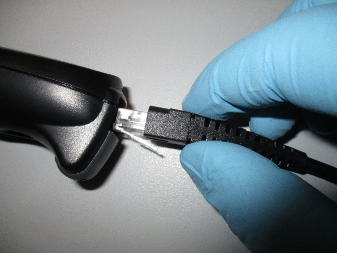 Insert the RJ-45 connector into the handle of the New Hand-held Barcode Scanner.