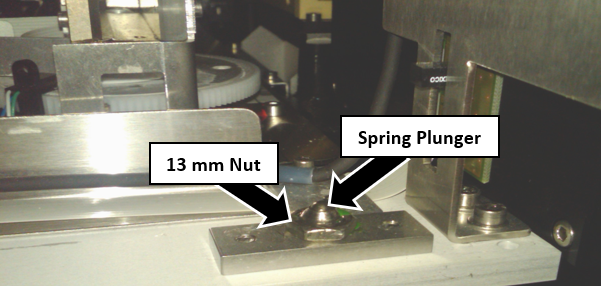 Locate the Input Queue spring plunger mechanism. Locate the thin 13 mm nut that fastens the spring plunger to the rest of the module.
