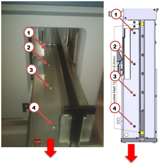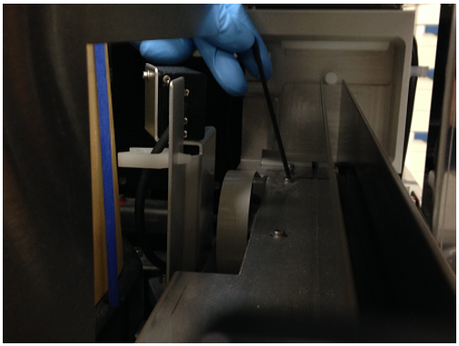 - Loosen screws 2, 3, and 4 with a 2mm hex key if the Input Queue Rail Alignment Tool gets stuck near the front of the Input Queue. Do not loosen screw 1.