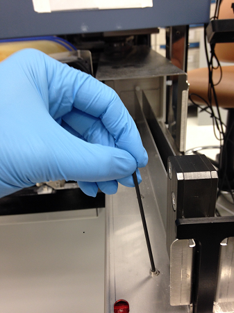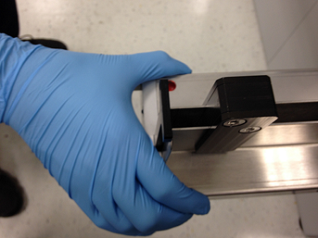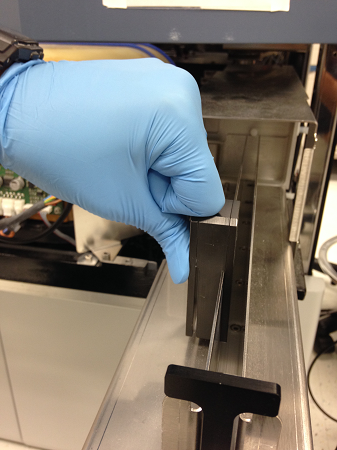 - Gently squeeze the rails together to set them against the Input Queue Rail Alignment Tool as seen below.