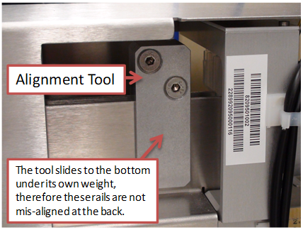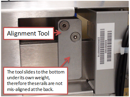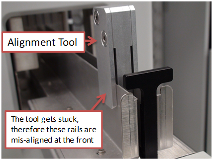 - With the screws loosened place the Alignment Tool on the rails near the location where it previously would become stuck (front or rear). The tool should now slide onto the rails without resistance.