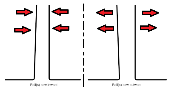 - Using the Input Queue Rail Alignment Tool as a guide, try to determine if the rails bow inward or outward as shown below.