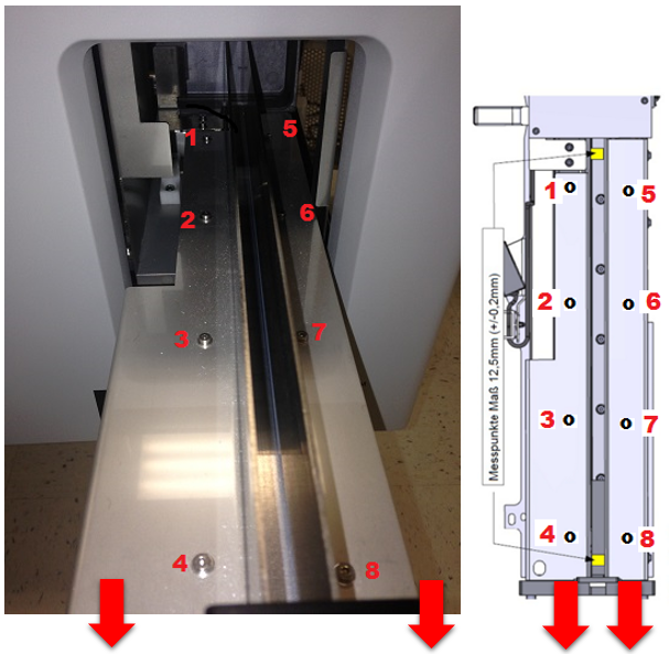 - Loosen screws 2, 3, 4, 6,7, and 8 with a 2 mm hex key if the Input Queue Rail Alignment Tool gets stuck near the front of the Input Queue.
