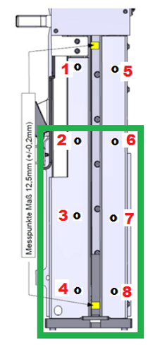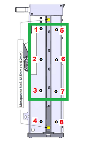 | Note—The image below shows a green square surrounding the screws that need to be loosened to align the rear of the Input Queue. Do not loosen screw 4 and 8. |