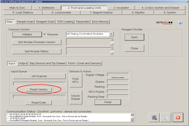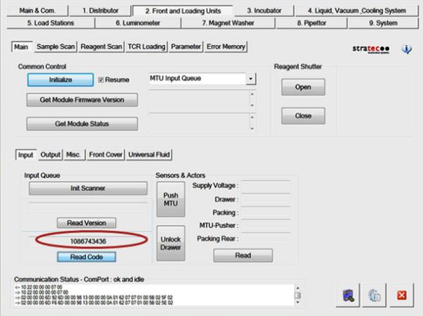 Press the Read Version button. This will display the firmware version of the MTU Input Queue barcode reader. Verify that the firmware version is as expected.- Place several MTUs in the MTU Input Queue and close the drawer.