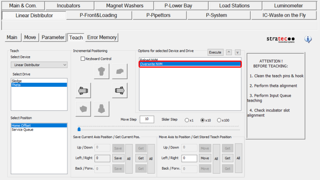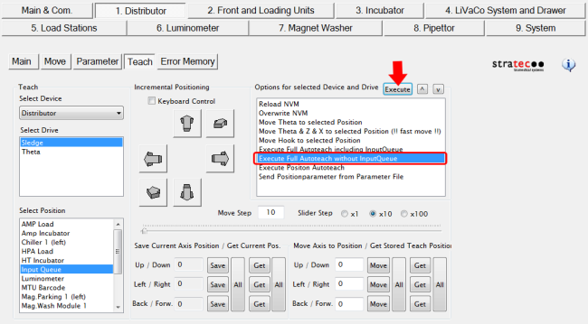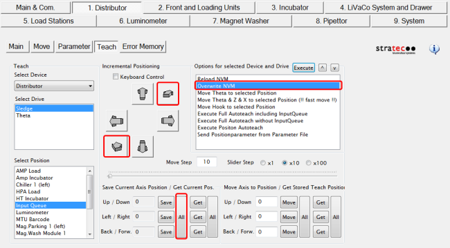 - On the Teach tab, select Service Queue in the Select Position box. Then double-click Move Theta & Z & X to selected Position (!!fast move!!) to move the Distributor to the Service Queue.