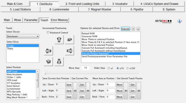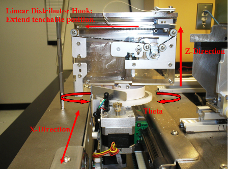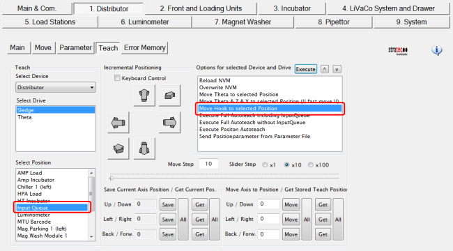 - Retract the hook into the Distributor head by selecting Distributor > Teach > Sledge, and double-clicking Move Theta & Z & X to Selected Position (!!fast move!!).