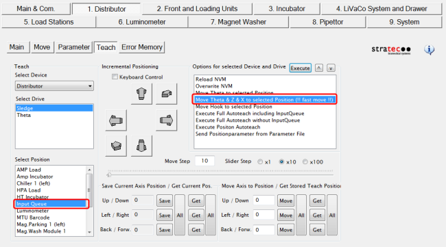 Select Input Queue from the Select Position list and double-click Move Theta & Z & X to Selected Position (!! fast move !!).