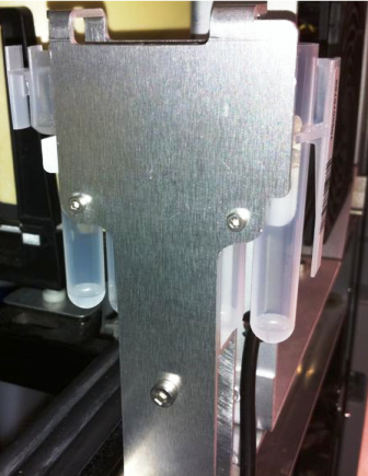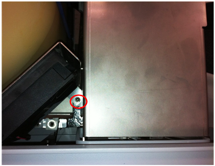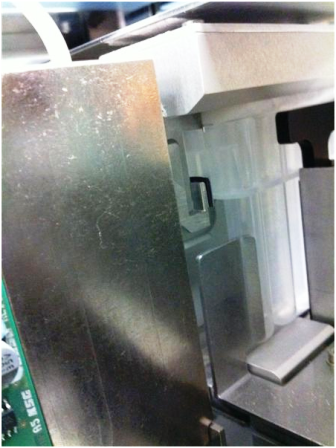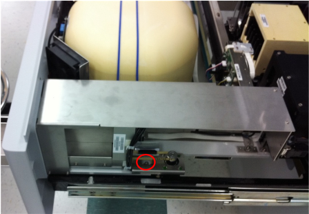Caution—When accessing the screw that is closest to the Luminometer, be very careful not to let the Allen wrench contact the PCB board, this can short out the board and damage it. - Push down on the red button located on the MTU Input Queue to unlock the MTU drawer.