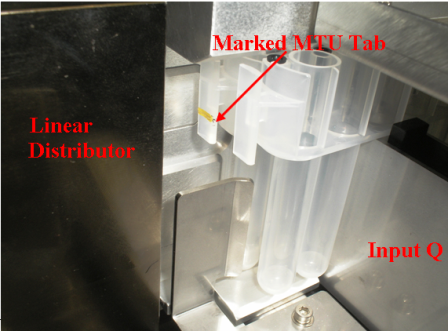 Gently slide the MTU Input Queue in the Y-axis until the marked MTU tab is centered in reference to the Distributor hook.