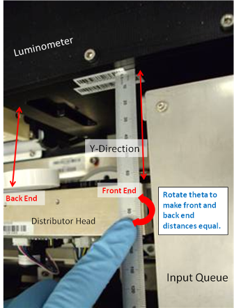 - Use a ruler and the Luminometer module as a reference to align the Distributor in the Theta direction.
