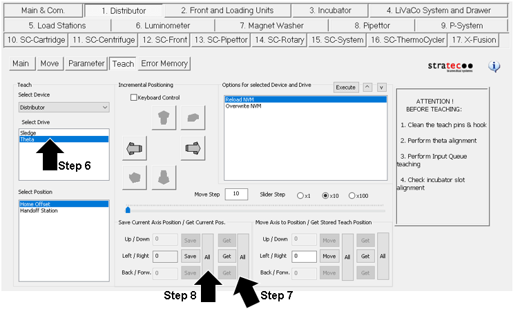 - Once the Distributor is parallel to the Luminometer, press Get All (under Get Current Axis Position), then Save All (under Save Current Axis Position) to save the Theta position (this will also calculate Theta for all other modules).