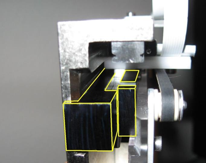 With the hook fully extended, slip the hook shim tool in between the left-side of the rail and the distributor head wall in the orientation as shown.