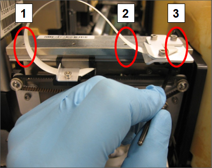 With the tools installed, re-tighten the 3 exposed linear bearing rail screws in the order shown numbered 1–3.