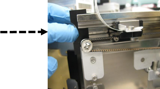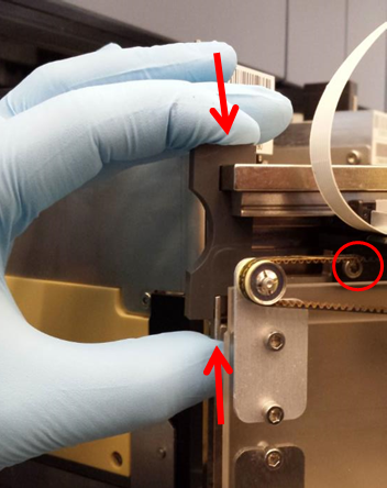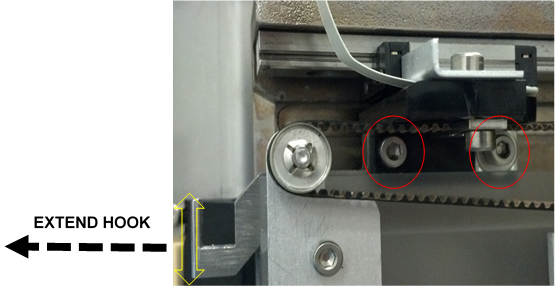 - Loosen (do not remove) the 2 hook mounting screws. (The hook should now move a few millimeters in the Z-direction.)
