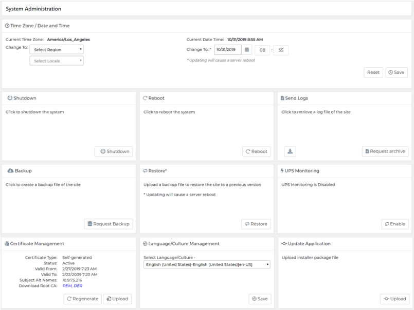 Note— Super Users can ONLY access Time Zone, Date and Time, Reboot, Send Logs, and UPS Monitoring options. Dashboard Administrators can access all the System Administration screen options. |