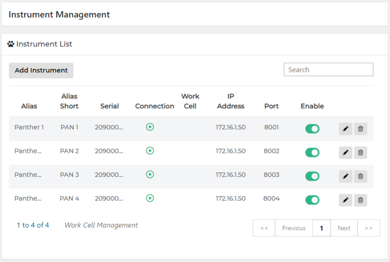 The Enable column allows users to temporarily disable the dashboard connection for that specific instrument.